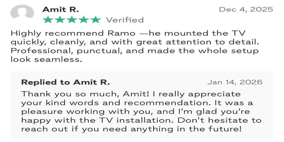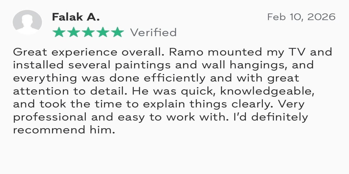 Ramohandyman provides precision and a clean finish for all your TV mounting needs. We ensure perfectly centered TVs, skillfully hidden or neatly managed wires, and soundbars and shelves aligned flawlessly for an immaculate look.